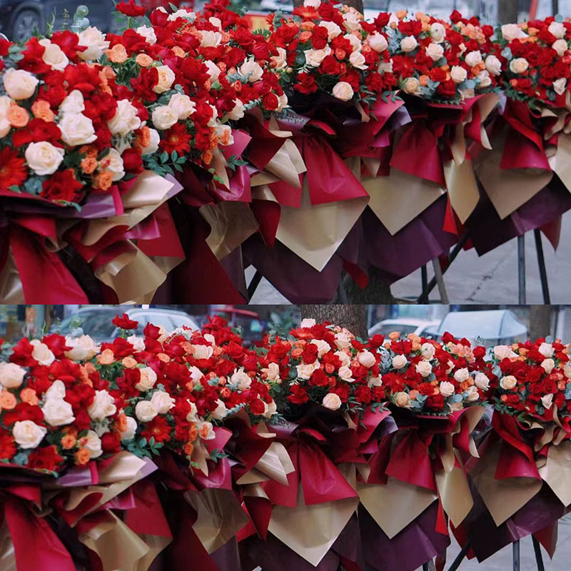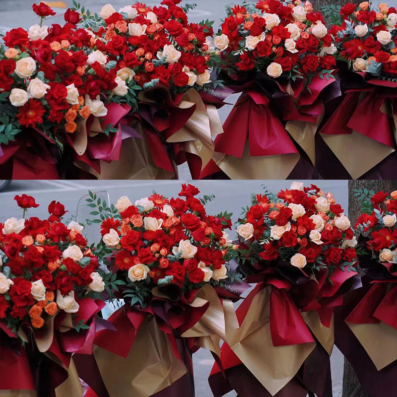 花 材:香槟玫瑰、红玫瑰、红色弗朗共30朵,搭配多头橙色小玫瑰,尤加利叶装饰。红色/金色双面纸包装,同色系花结。