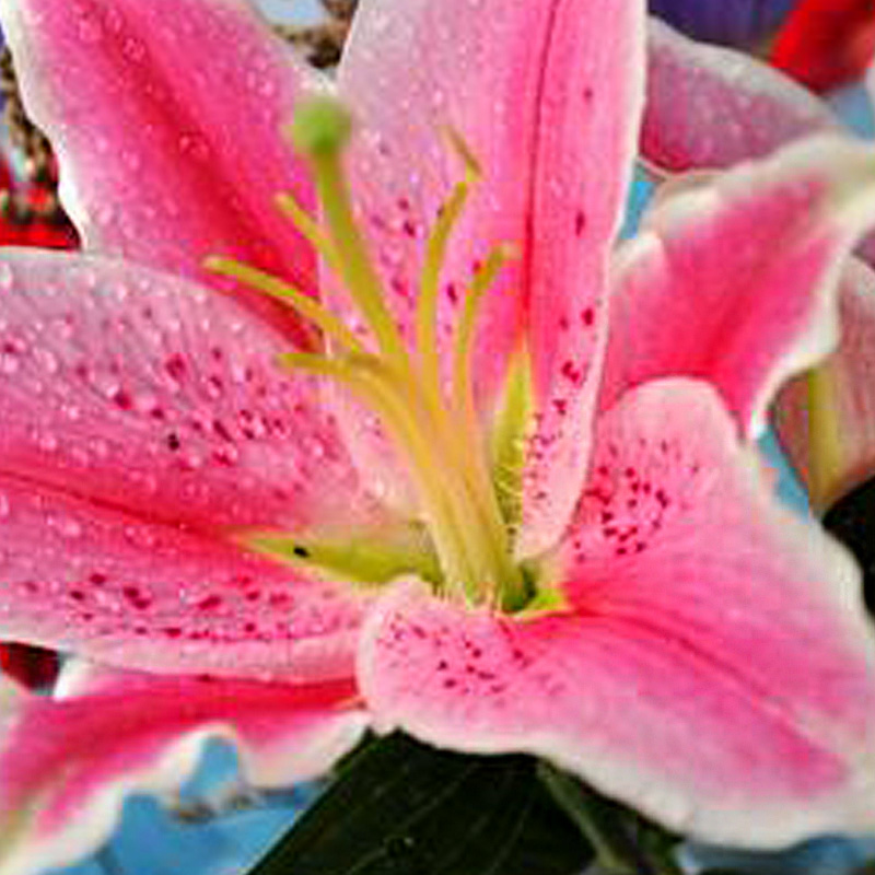 花 材:粉红香水百合两扎,粉玫瑰半扎,粉色向日葵半扎,搭配适量散尾葵,蓝色棉纸包裹。
