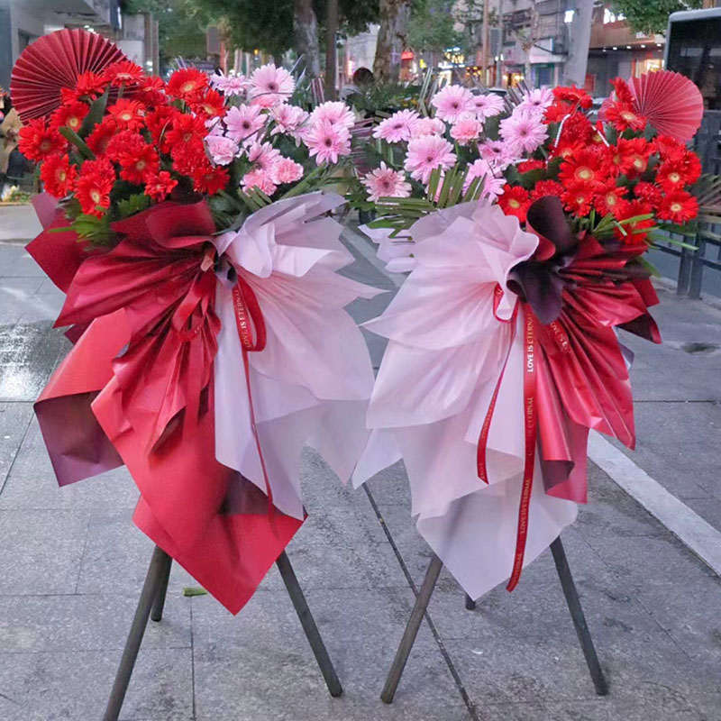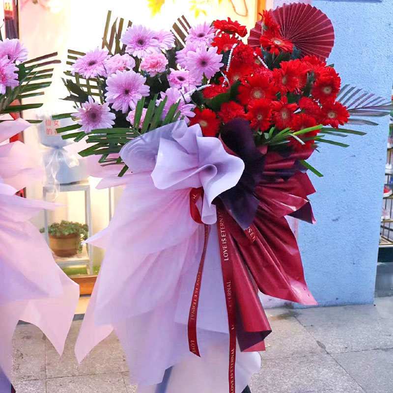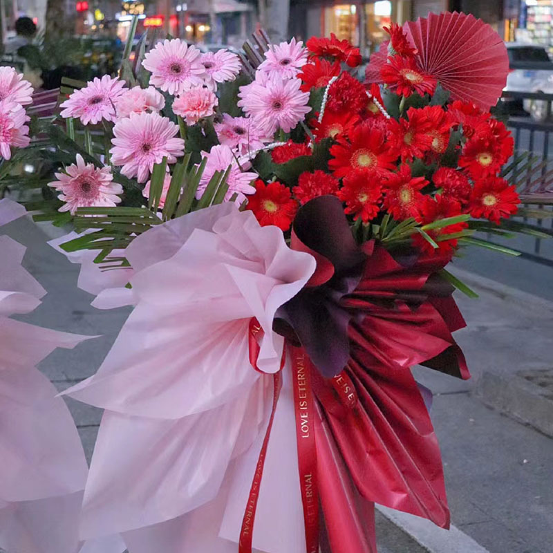 花材: 粉色弗朗、红色弗朗共36朵,花材和包装均一半红色、一半粉色造型,搭配散尾葵、圆形折纸装饰。