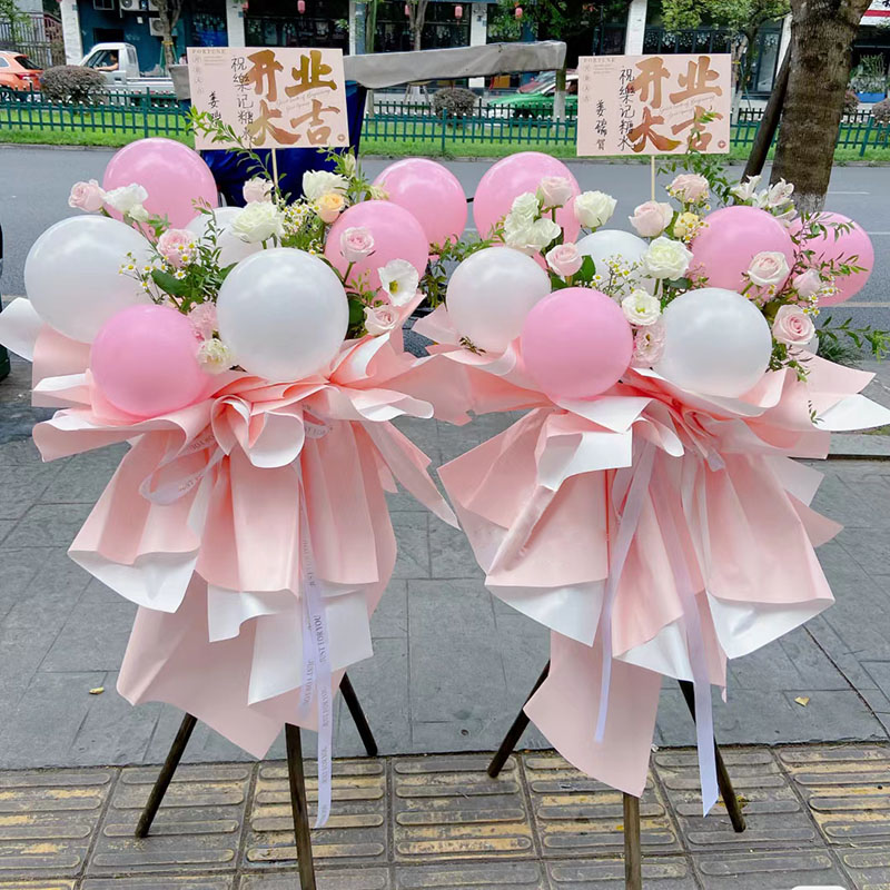 花 材:8个粉色/白色气球,11朵彩玫混搭,搭配桔梗、尤加利叶。粉色包装。