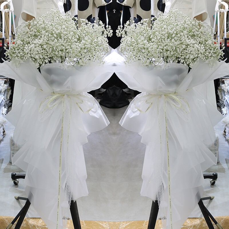 花 材:白色满天星,透明雾面纸韩式束扎,香槟色花结。