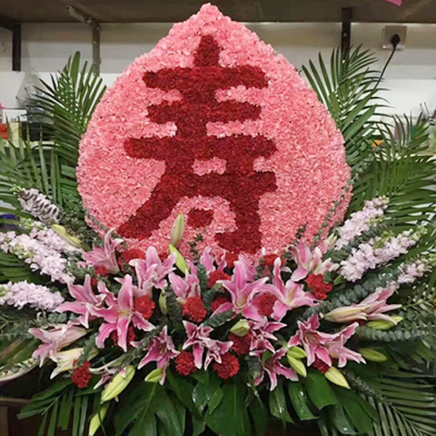 花 材:粉色康乃馨做背景,红色康乃馨拼成“寿”字,造型呈寿桃状。底座用百合、康乃馨、金鱼草,八角叶,散尾葵等配草。