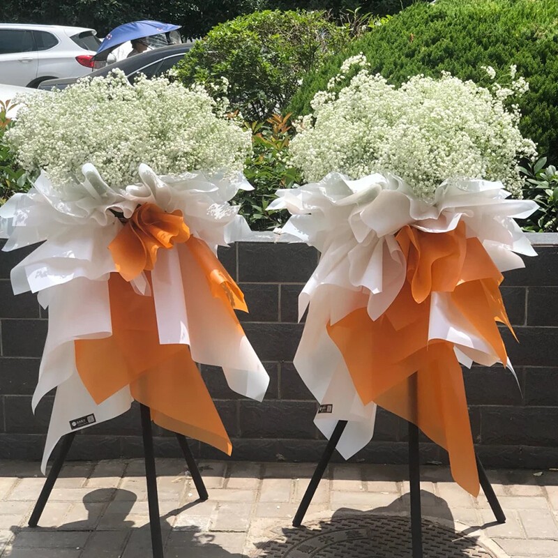 花 材:白色满天星,白色、橙色雾面纸多层包装,同色系花结。