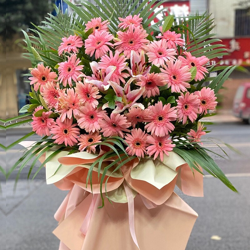 花材: 36朵粉色扶郎花,1支多头粉色香水百合,搭配栀子叶、散尾葵。粉色双面欧雅纸束扎,粉色花结。