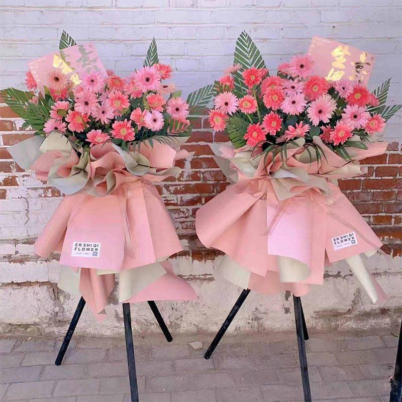 花 材:26朵粉色扶郎花,搭配散尾葵装饰。粉色双面纸花束包装。
