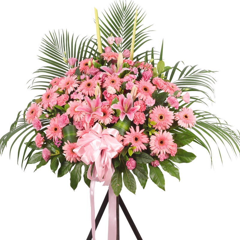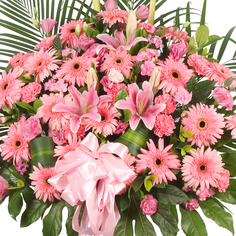 花 材:粉色扶郎花、粉色康乃馨、粉色桔梗、3支多头粉百合、剑叶、巴西叶、散尾葵、栀子叶。