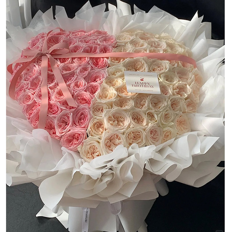 • 【月下听花】粉荔枝玫瑰、白荔枝玫瑰共99朵,一半粉色、一半白色组成心形造型,搭配粉色丝带蝴蝶结装饰花面。