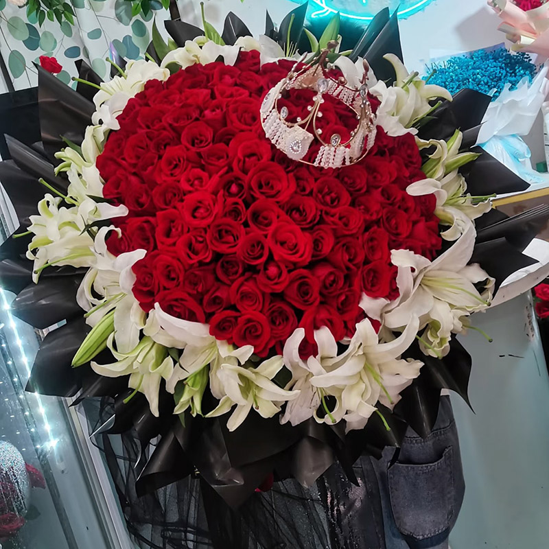 • 【我喜欢你】99朵顶级红玫瑰,33朵白色香水百合外围环绕,皇冠装饰花面。