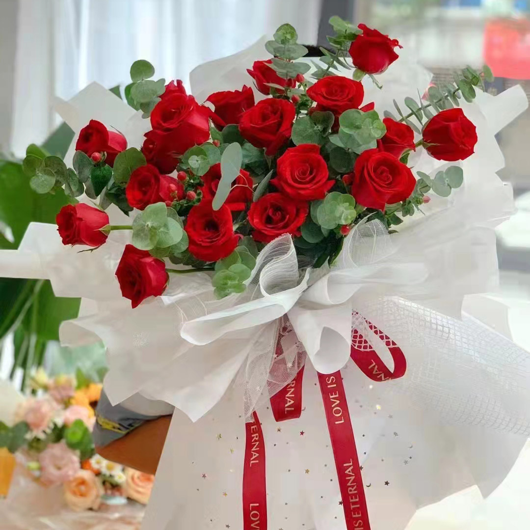【阳光甚好】精选19朵红色玫瑰,搭配尤加利叶装饰。