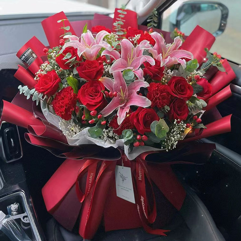 【欢喜城】11朵红玫瑰,6支红色康乃馨,2支粉色多头香水百合,搭配火龙珠、尤加利叶、满天星装饰。