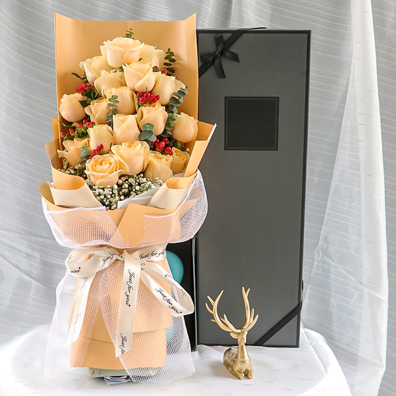 【春风化雨】19支香槟玫瑰,搭配10支白色洋桔梗(断货则用12支白玫瑰代替),尤加利叶装饰。