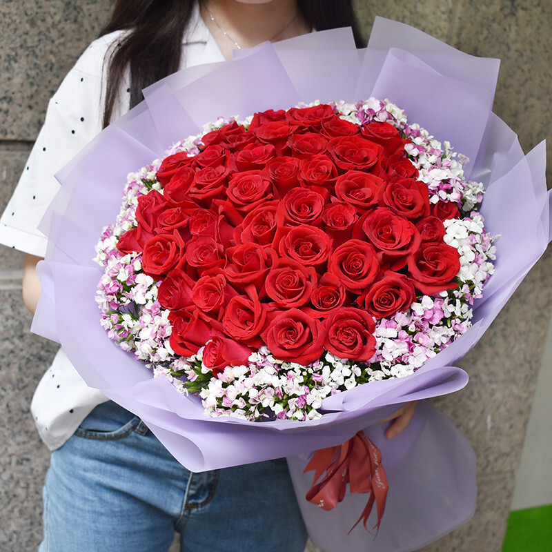 【为爱见证】33支精品红玫瑰,外围搭配适量白色满天星、黄莺。