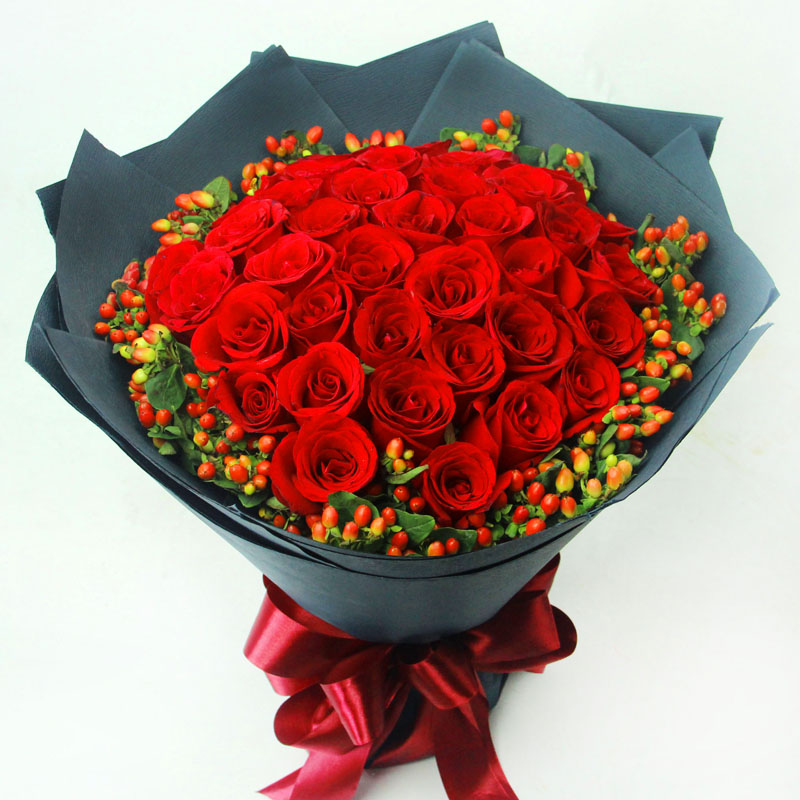 【爱你不是两三天】33朵红玫瑰,6支红色多头红玫瑰(断货则用同数量橙色泡泡或者洋桔梗代替),尤加利叶间插。