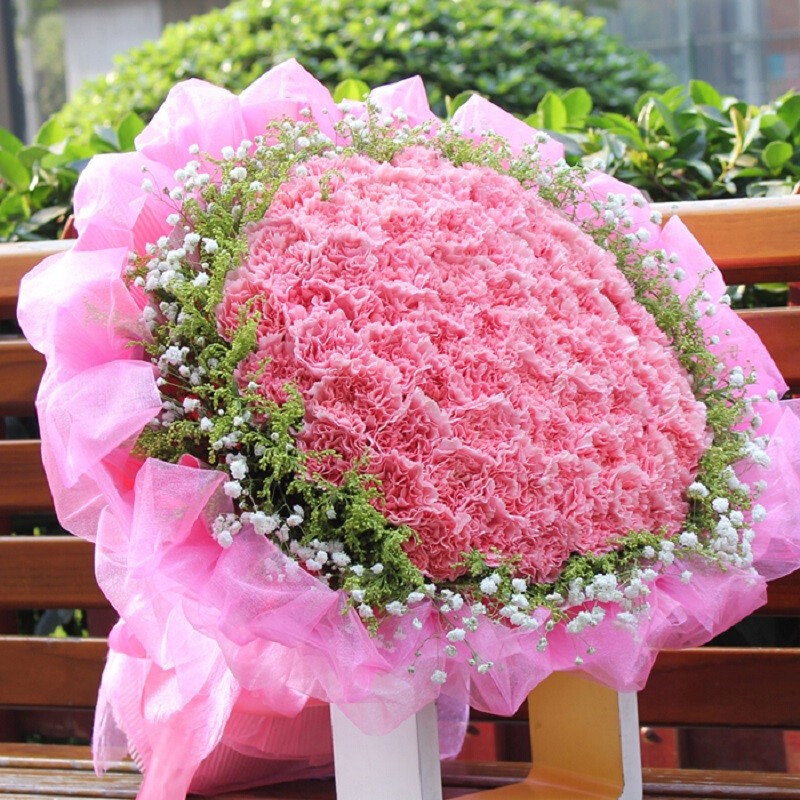 【细品岁月】99朵粉色康乃馨,黄英草、满天星外围环绕。