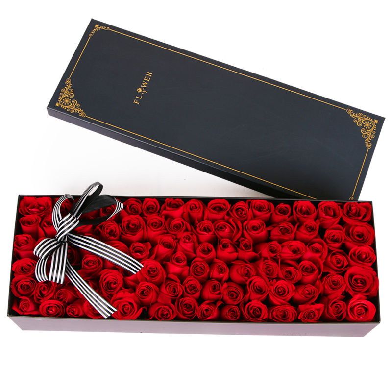 【爱你无悔】精选99朵红玫瑰,1条灯带,1条珠链,花型心形造型,缎带花面装饰。