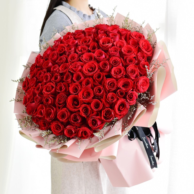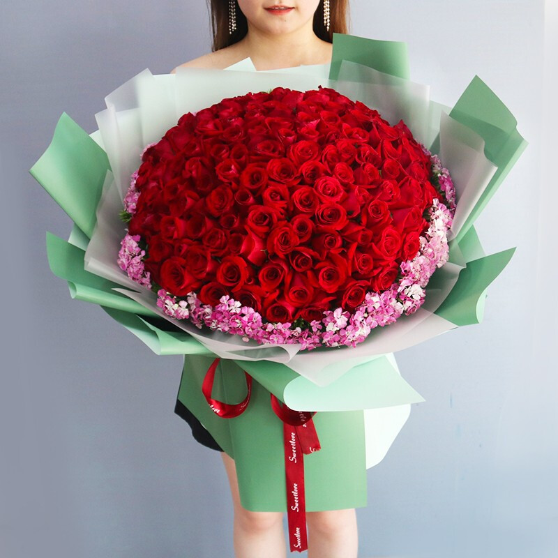 【此情不渝】99朵红玫瑰,搭配适量情人草装饰。