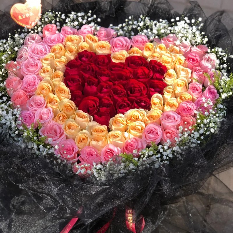 【半城春色】99朵玫瑰混搭心形造型,红玫瑰在最里层,香槟玫瑰居中,粉玫瑰外围,满天星、黄莺草环绕装饰。