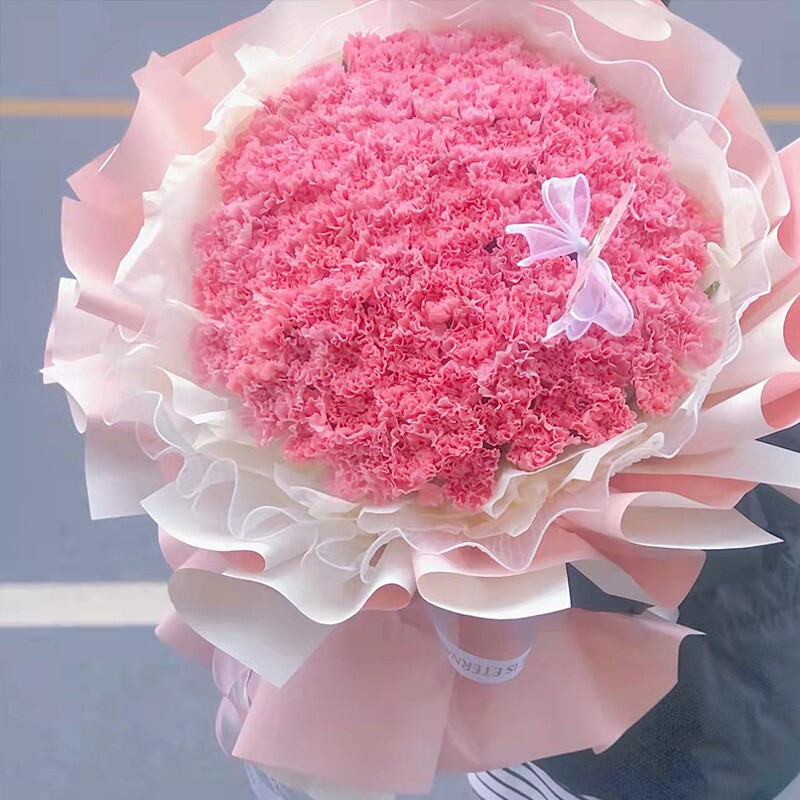【您的笑容】99支粉色康乃馨,蝴蝶结装饰花面。