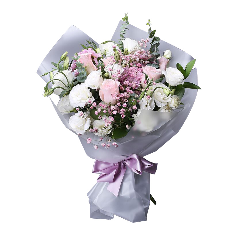 • 【风轻云净】5支粉玫瑰,4支白桔梗(若白桔梗断货,则用6支白玫瑰替换),搭配适量粉色满天星、紫色小菊花、尤加利叶、绿叶。