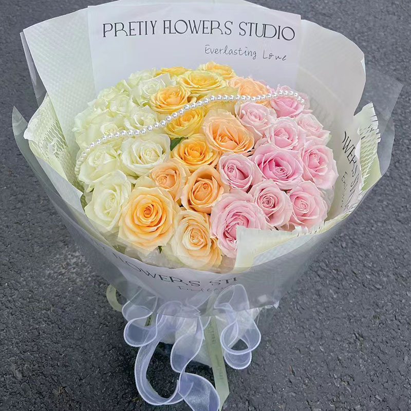 • 【光明未来】33朵渐变色玫瑰(白色、香槟色、粉色),搭配1条珠串。
