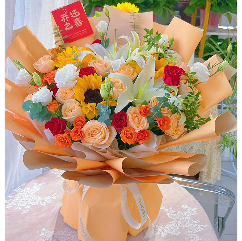 • 【风和日暖】19朵玫瑰混搭(香槟色玫瑰为主,红色、白色玫瑰搭配),3朵向日葵,2支白色多头香水百合,6支白色洋桔梗,6支橙色多头小玫瑰,搭配尤加利叶装饰。