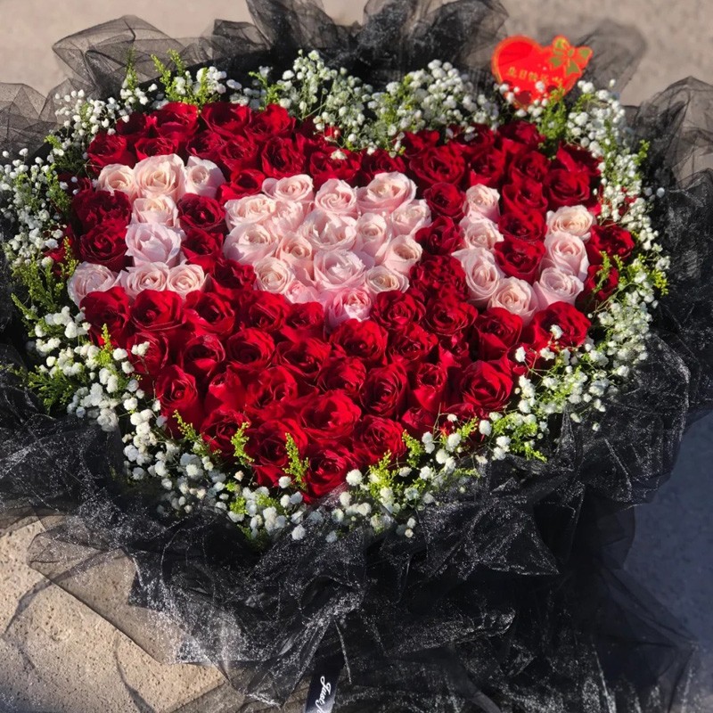 • 【一生爱你】99朵玫瑰心形造型,粉玫瑰拼成“I ❤ U”形状,红玫瑰围边,满天星、黄莺草环绕装饰。