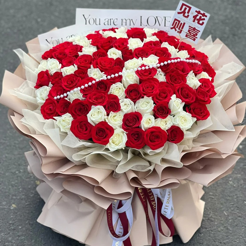 • 【只要你在】52朵红玫瑰白荔枝玫瑰混搭(30朵红玫瑰,22朵白荔枝玫瑰),搭配小珍珠装饰花面。