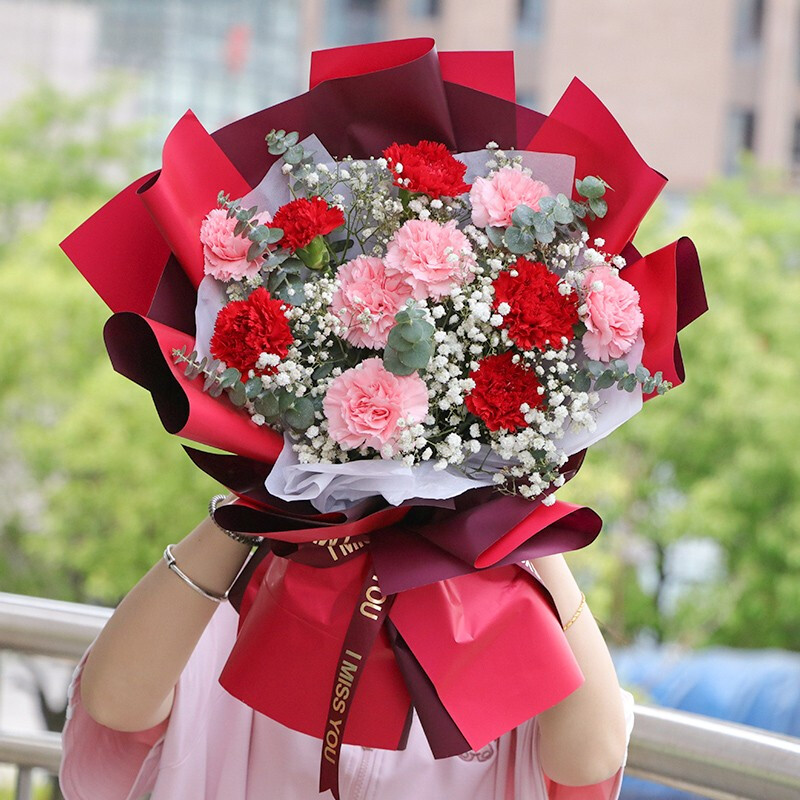 • 【无尽的思念】11朵康乃馨混搭(红色5朵,粉色6朵),白色满天星间插,尤加利点缀。