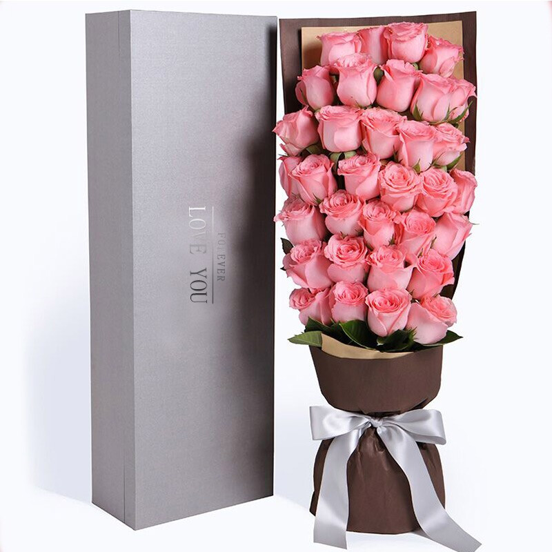 【雨中漫步】33朵精品粉玫瑰,搭配栀子叶装饰。