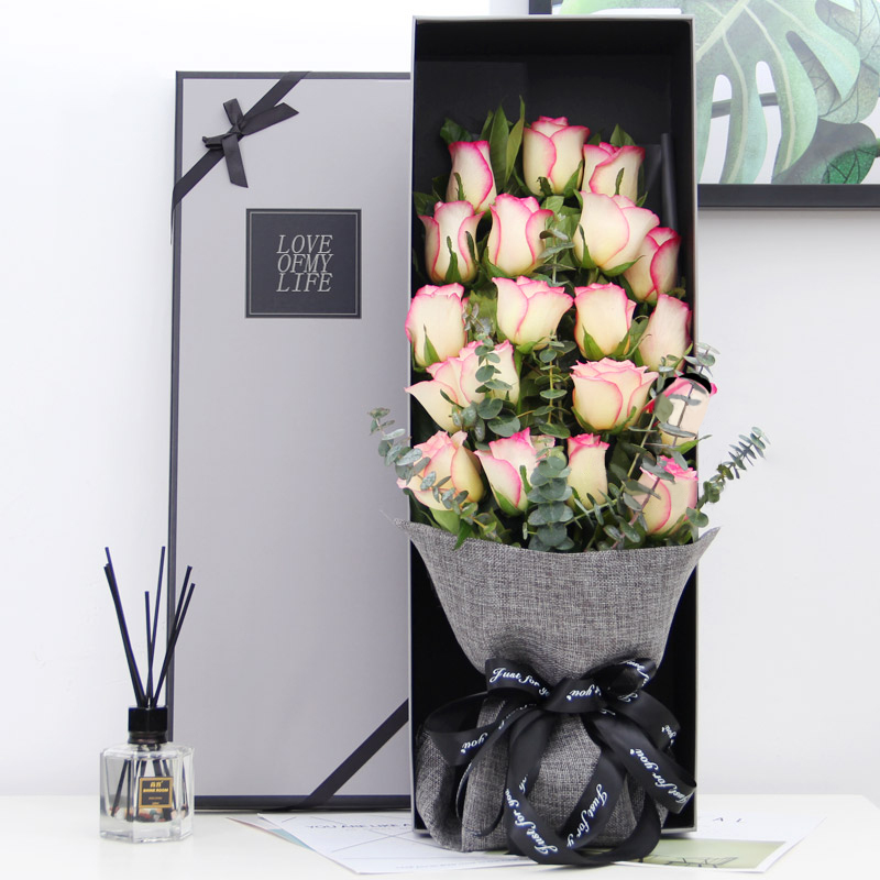 【1314-一生一世】33支混色玫瑰(5支香槟玫瑰+5支白玫瑰+11支红玫瑰+12支粉玫瑰),搭配适量栀子叶。