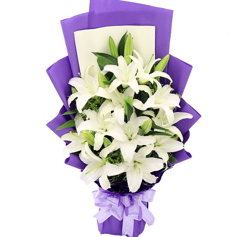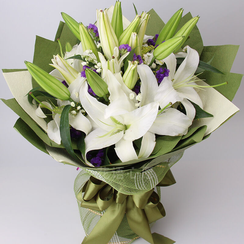 【爱的祝福 】24朵白百合,紫色小花、黄莺草点缀。