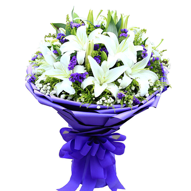 【纯洁的爱】 白百合21朵,搭配紫色勿忘我,绿叶、满天星。
