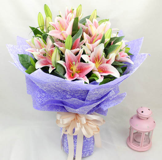 【矢志不渝 】精选18朵粉色百合,搭配2支洋桔梗、尤加利叶装饰。