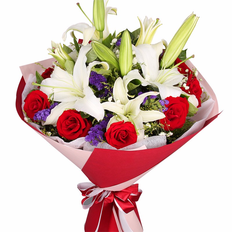 【永恒的誓言】11支精品红玫瑰+3支多头白百合,搭配适量紫色勿忘我、白色满天星、黄莺草、栀子叶。