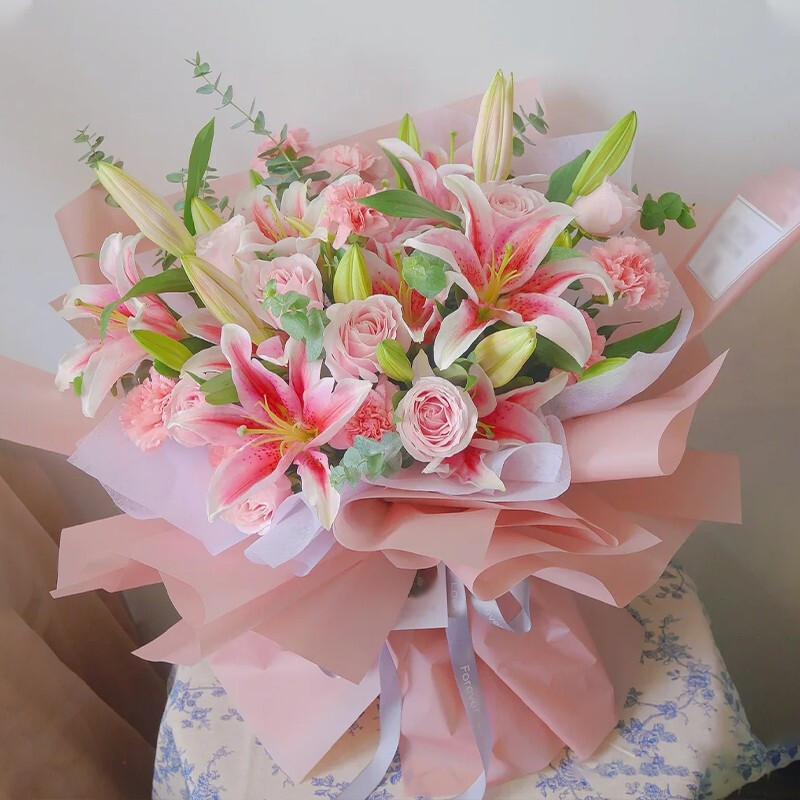 【绽放的祝福】19朵粉色康乃馨玫瑰混搭(8朵粉玫瑰,11朵粉色康乃馨),5支多头粉色香水百合,搭配尤加利叶装饰。
