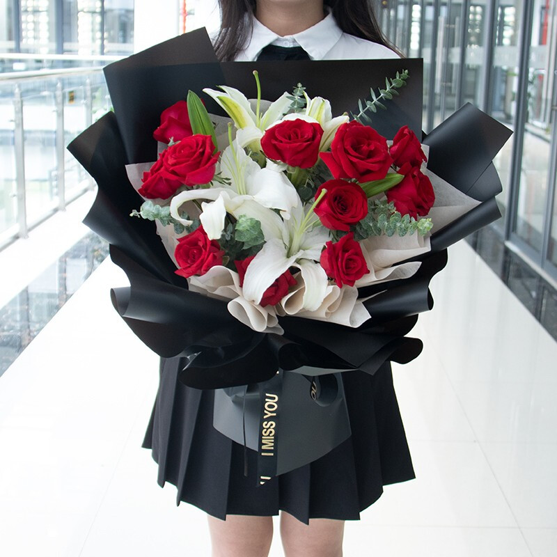 • 【浪漫香气】9支红玫瑰+4支多头白百合,搭配适量尤加利叶装饰。