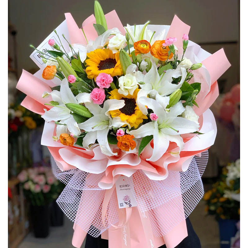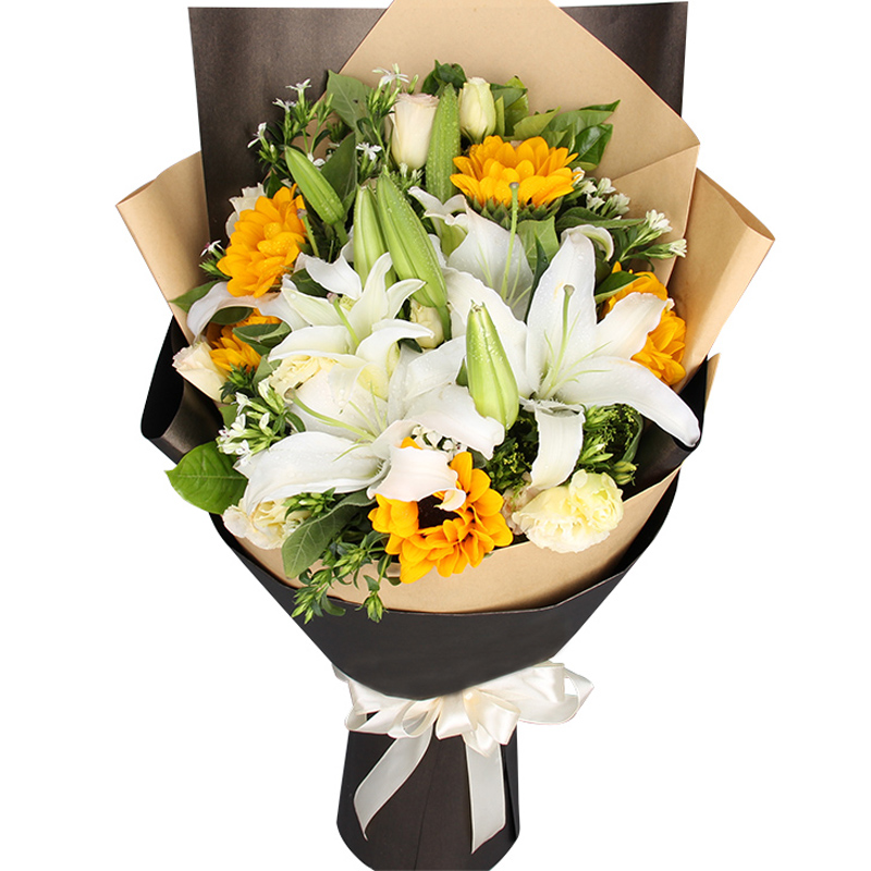 • 【祝安好】2朵向日葵,4支多头白色香水百合,搭配4支橙色多头小玫瑰,4支多头粉康(断货则用同数量的洋桔梗、粉康代替),栀子叶装饰。