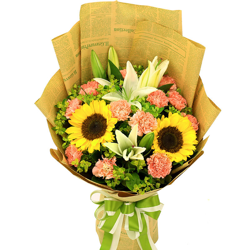 • 【燕尾蝶】12支粉色康乃馨+2支多头白百合+2支向日葵,搭配黄莺、绿草。
