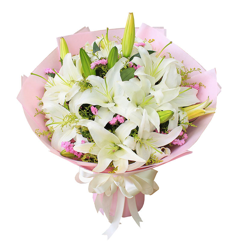 • 【百事百合】6支(约16朵)白色多头香水百合,搭配6支洋桔梗,洋甘菊,尤加利叶装饰。