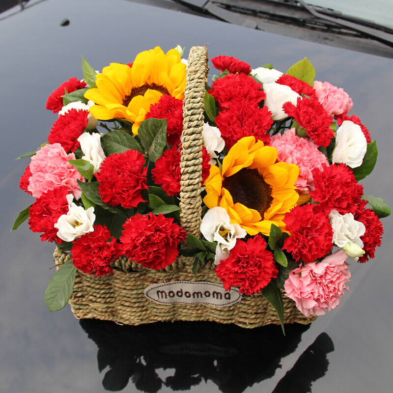 【屋顶花园】精选2朵向日葵,20朵红色康乃馨,5朵粉色康乃馨,9支白色洋桔梗(断货则用9朵白玫瑰代替),栀子叶装饰。