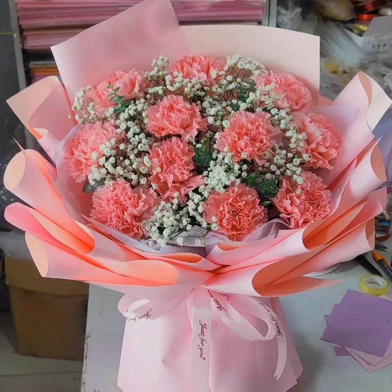【幸福唯爱】11支粉色康乃馨,搭配满天星,尤加利叶装饰。