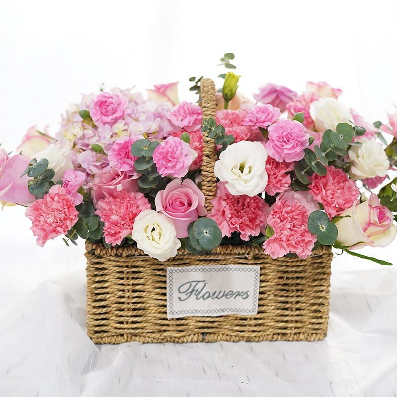 【粉色密语】1支粉色绣球,16朵粉色康乃馨,6朵粉玫瑰,11支白色洋桔梗(断货则用11朵白玫瑰代替),搭配桔梗、多头粉康、尤加利叶等配花装饰。
