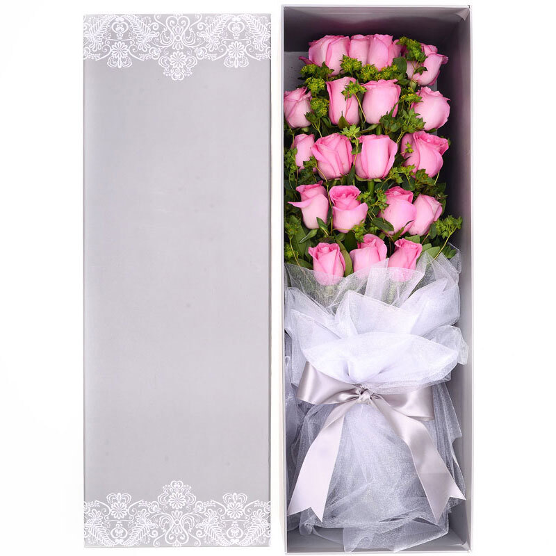 【情窦初开】19枝精品粉玫瑰,搭配叶上金、绿叶。