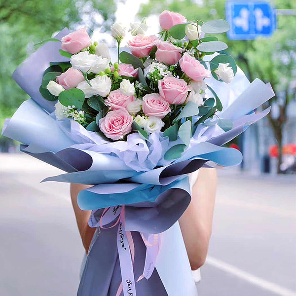 【曾经的少年】 戴安娜粉玫瑰33枝、白色洋桔梗5枝、粉色洋桔梗2枝、粉紫小菊3枝、浅蓝绣球1枝,尤加利10枝