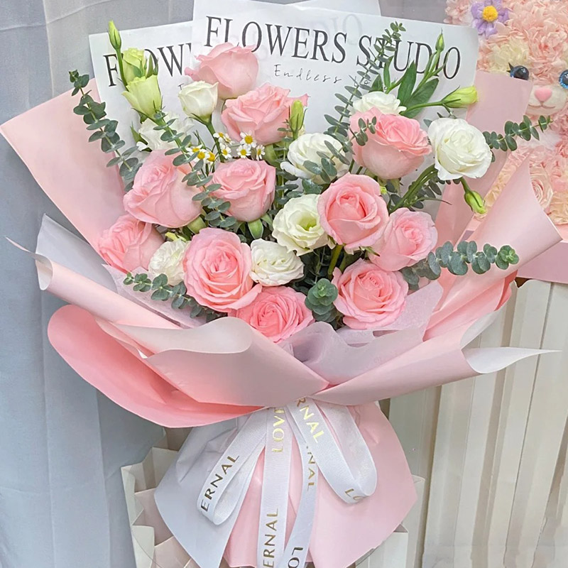 【伸手挽月】19朵混搭玫瑰(11朵粉玫瑰、8朵白玫瑰),洋桔梗、相思梅,尤加利叶装饰。