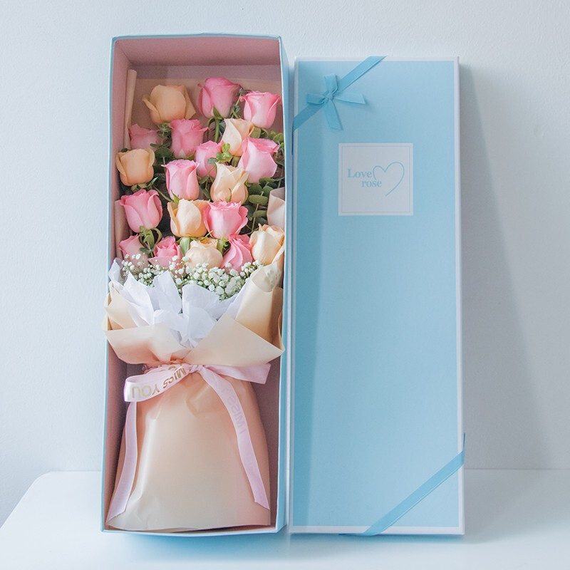 • 【世间美好】19朵混搭玫瑰(粉色、香槟色),搭配尤加利叶、白色满天星装饰。