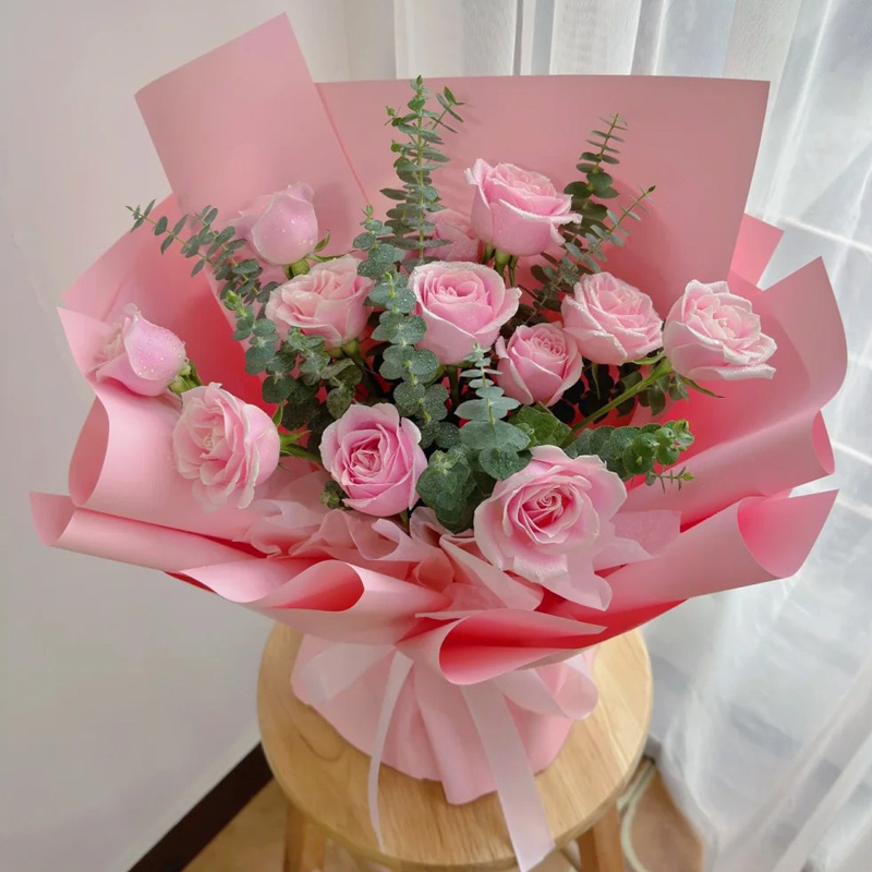 • 【粉色公主】11朵粉玫瑰,尤加利叶装饰。