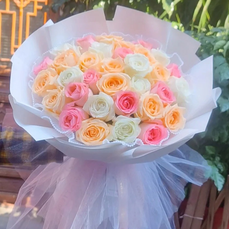 【三色情缘】33朵玫瑰混搭(香槟玫瑰,粉玫瑰,白玫瑰)。
