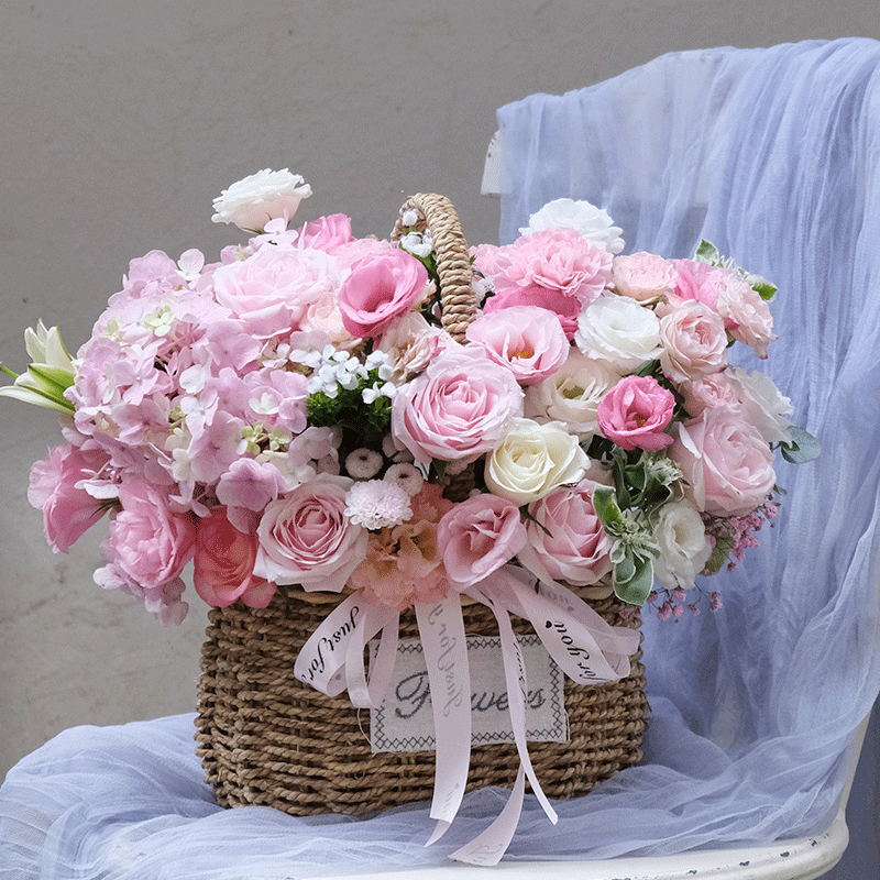 【风轻云净】5支粉玫瑰,4支白桔梗(若白桔梗断货,则用6支白玫瑰替换),搭配适量粉色满天星、紫色小菊花、尤加利叶、绿叶。