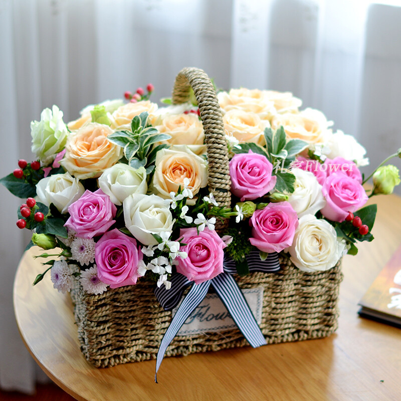 【美的音符】精选33朵(白色、粉色、香槟色)玫瑰混搭,搭配相思梅,小雏菊,银叶菊等配花。